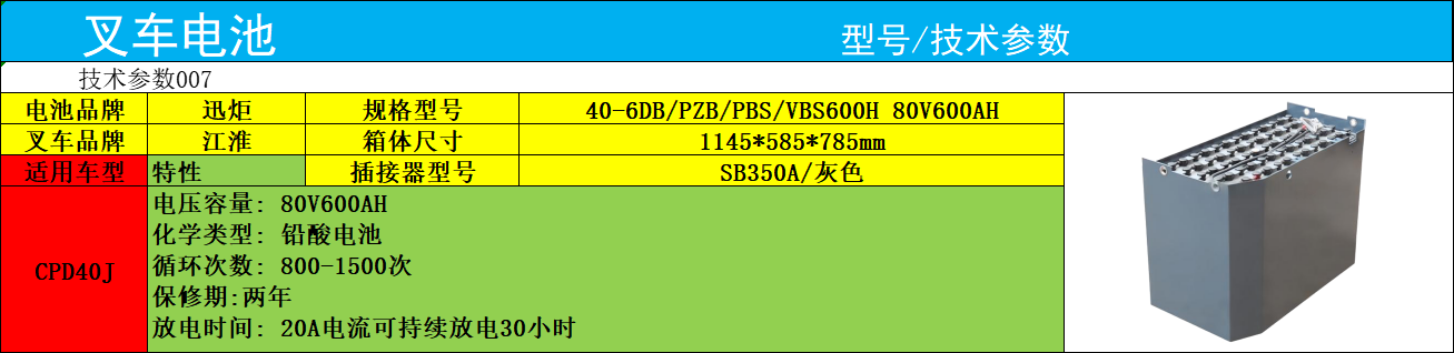 江淮叉車電瓶CPD40J 迅炬40-6VBS600叉車電瓶容量大壽命長80V600AH江淮叉車電瓶CPD40J是專為4噸級電動叉車打造的動力核心,電池型號40-6VBS600對應(yīng)核心叉車電瓶容量80V600AH,由40只2V單體電池串聯(lián)組成,鐵箱尺寸*控制在1145×585×785mm,可*嵌入CPD40J系列叉車原廠電池艙,無需改造即可完成換裝。該電池依托管式極板技術(shù),能穩(wěn)定釋放80V600