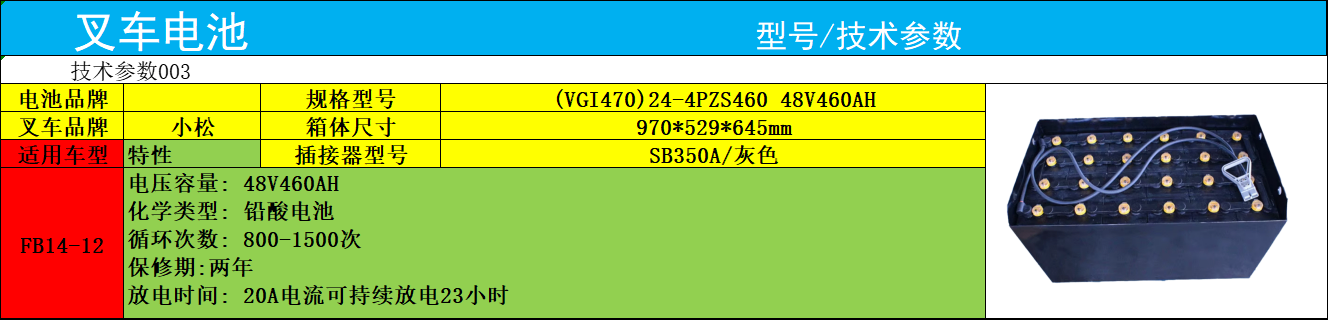 小松叉車專用電池24-4PZS460 迅炬48V460AH電動(dòng)倉(cāng)儲(chǔ)車電池型號(hào)參數(shù)作為專注電動(dòng)倉(cāng)儲(chǔ)車電池研發(fā)生產(chǎn)的企業(yè),我們針對(duì)小松FB14-12電動(dòng)倉(cāng)儲(chǔ)車量身打造的24-4PZS460,不僅是性能卓越的電動(dòng)倉(cāng)儲(chǔ)車電池,更是適配性極強(qiáng)的叉車專用電池。這款24-4PZS460嚴(yán)格遵循48V460AH的核心規(guī)格設(shè)計(jì),鐵箱尺寸*控制在970X529X645MM,與小松FB14-12的電池安裝艙*契合,