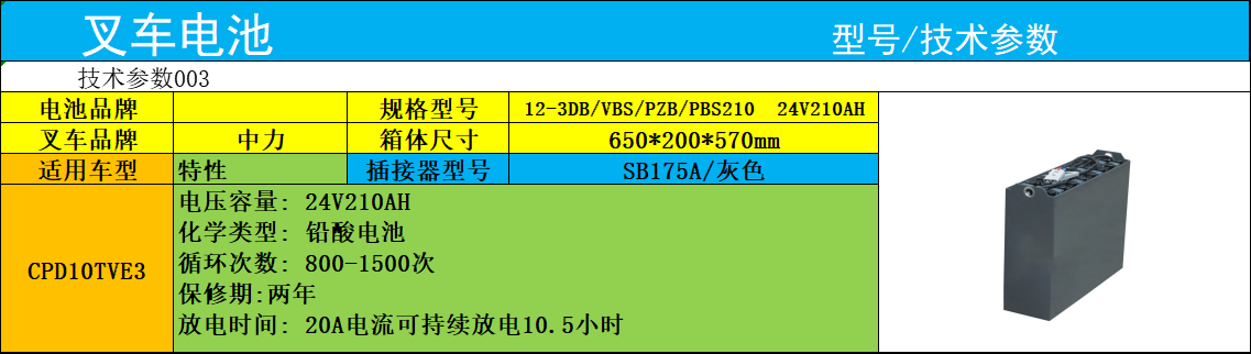 2. *適配性:650×200×570mm鐵箱尺寸*匹配叉車電瓶倉,SB175A插接器插拔便捷,這款3VBS210電池不僅是中力CPD10TVE3的專屬選擇,作為通用性迅炬堆垛車蓄電池,還能兼容合力、杭叉等品牌同級別堆垛車。