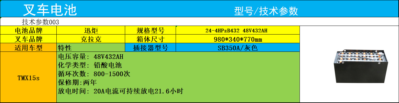 克拉克堆高車電池TMX15S 迅炬24-4HPZB432搬運(yùn)車電池48V432AH型號迅炬關(guān)聯(lián)克拉克TMX15S叉車電瓶(24-4HPZB432 48V432AH)參數(shù)及應(yīng)用簡介迅炬作為深耕工業(yè)動(dòng)力領(lǐng)域的專業(yè)品牌,長期為各類工業(yè)車輛提供適配電源方案,其中24-4HPZB432型號電池是專為克拉克TMX15S叉車定制的核心產(chǎn)品,這款以4HPZB432為核心標(biāo)識(shí)的電池,不僅是性能可靠的叉車電瓶,更是適